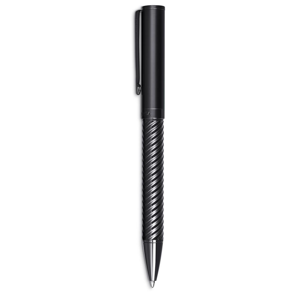 This Alex Varga Lagarna set is a distinguished corporate gift. It includes a ball pen and rollerball, both made from stainless steel and copper with matte black and embossed barrels. The ball pen has black German ink, writing for 3,000 metres. This set reflects the Alex Varga brand’s refined quality.