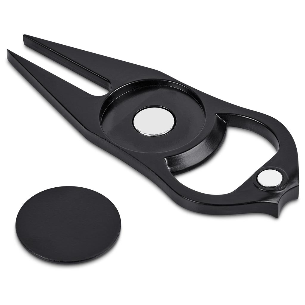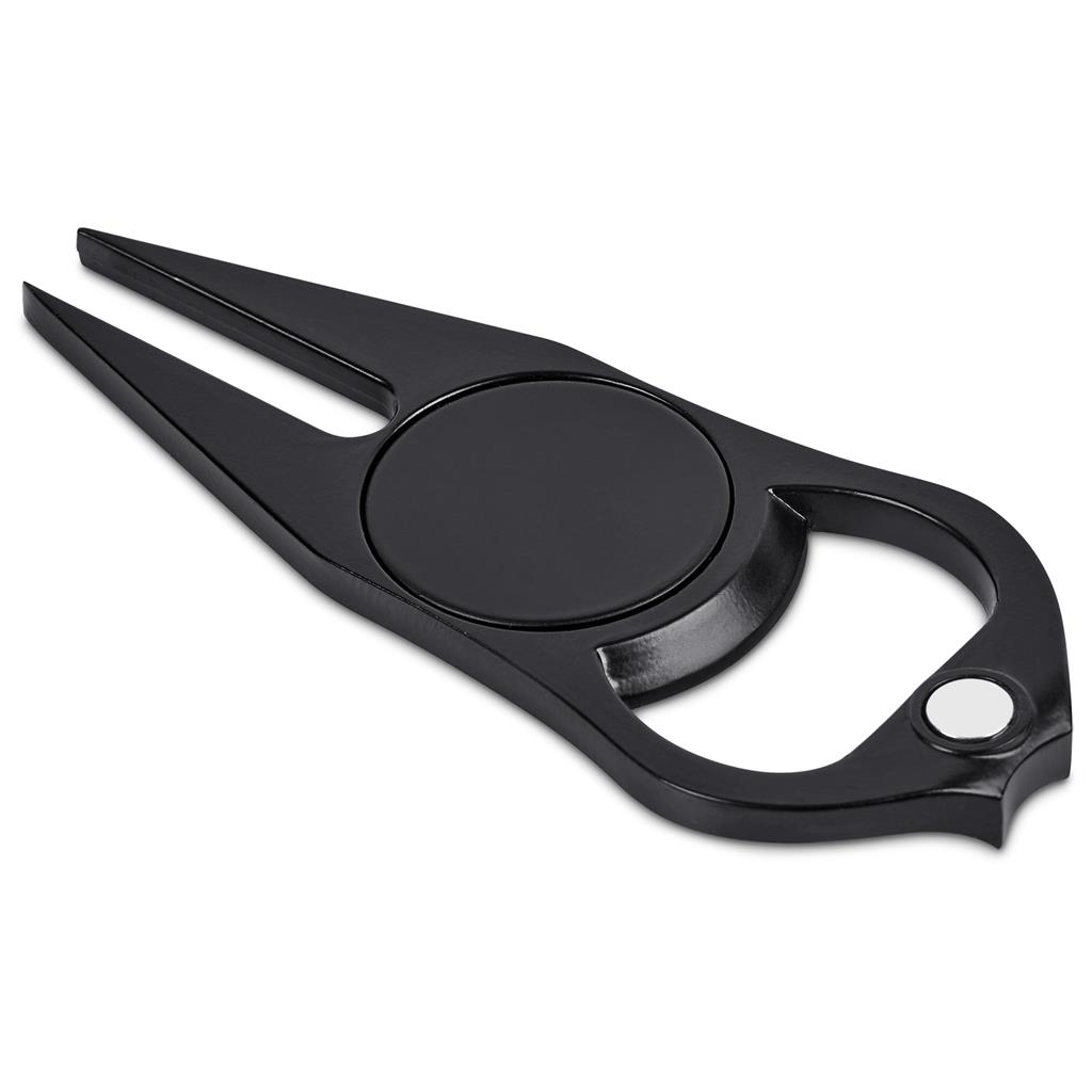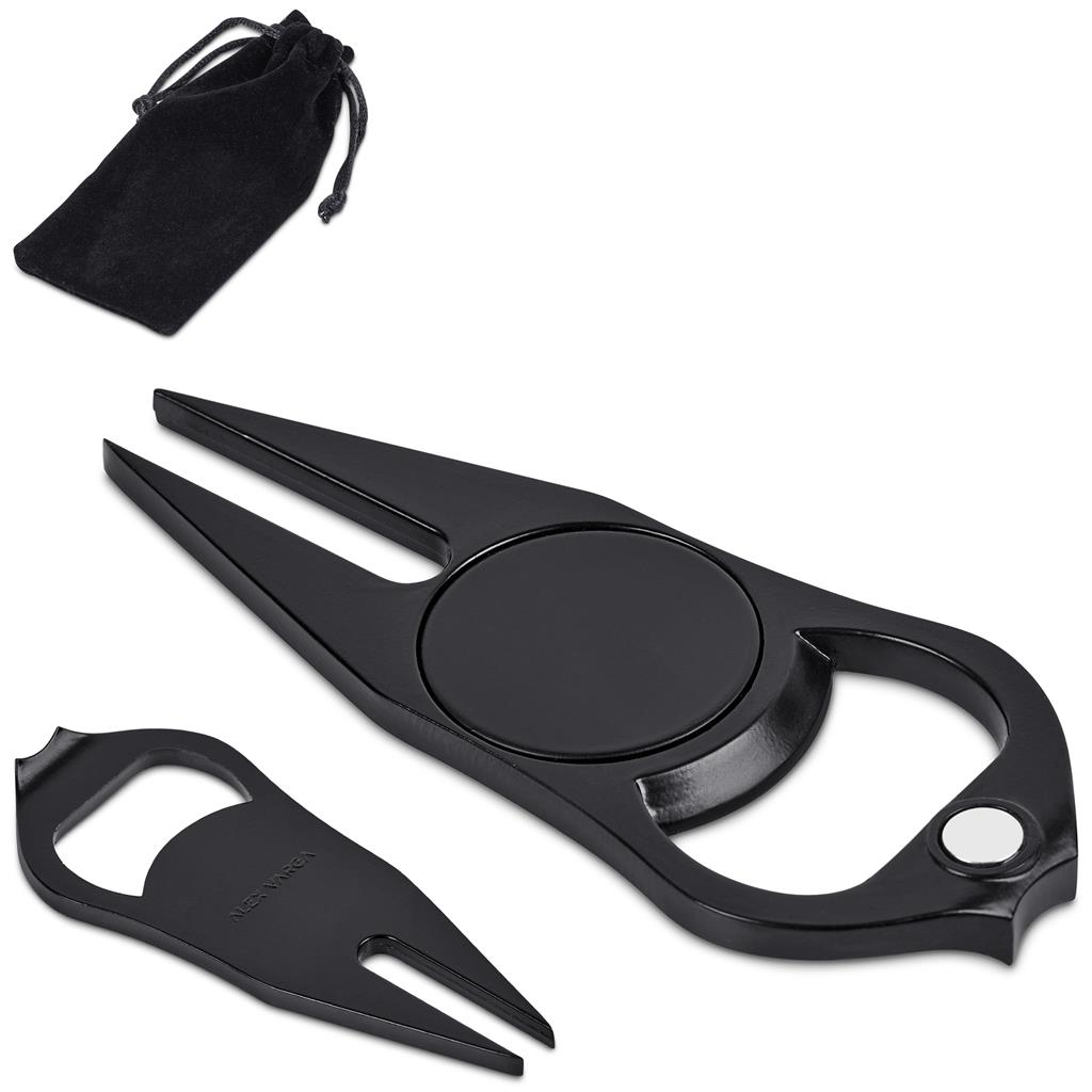 Golfers will appreciate this Alex Varga Porto Divot Tool for easy turf repair. It is made from strong iron and zinc alloy, featuring a magnetic ball marker and a bottle opener. The matte black finish with the Alex Varga logo offers a useful accessory.