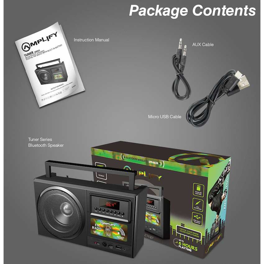 Enjoy diverse audio options with the Amplify Tuner Series Bluetooth Radio. It offers wireless Bluetooth connectivity, built-in FM tuning, and supports USB or SD card playback. Find stations quickly with auto-scan, providing up to 6 hours of sound from Amplify.