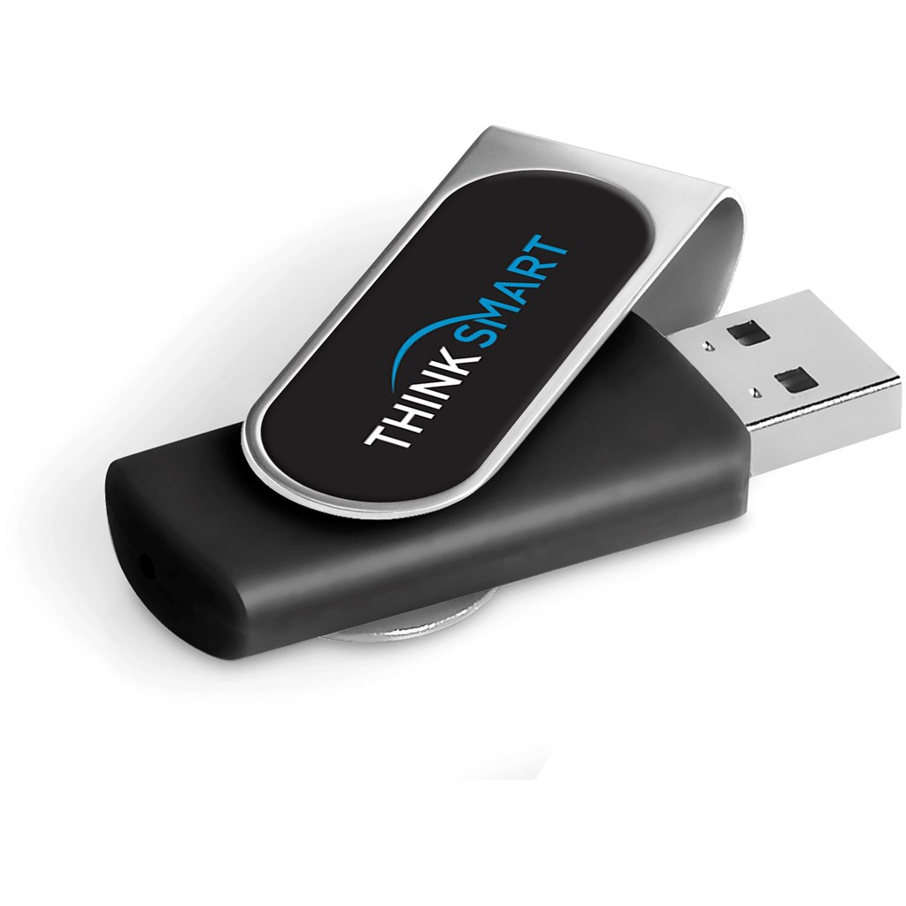 Classic flash drive with a soft-touch, lacquered base. The metal swivel is designed for vibrant, full-colour dome sticker branding which fits snugly into the recess. It has 4GB of memory, with a USB 2.0 interface. Presented in a transparent case.