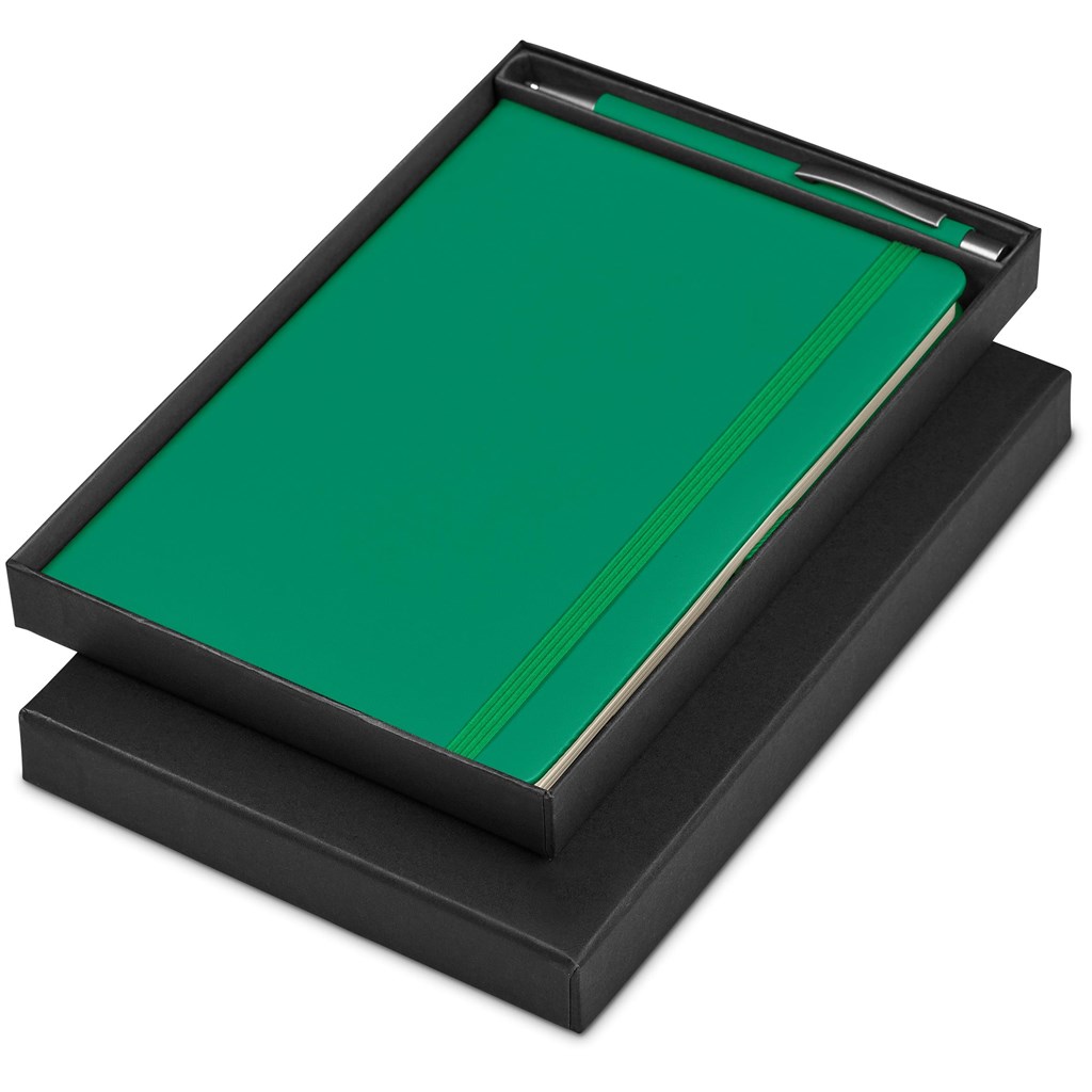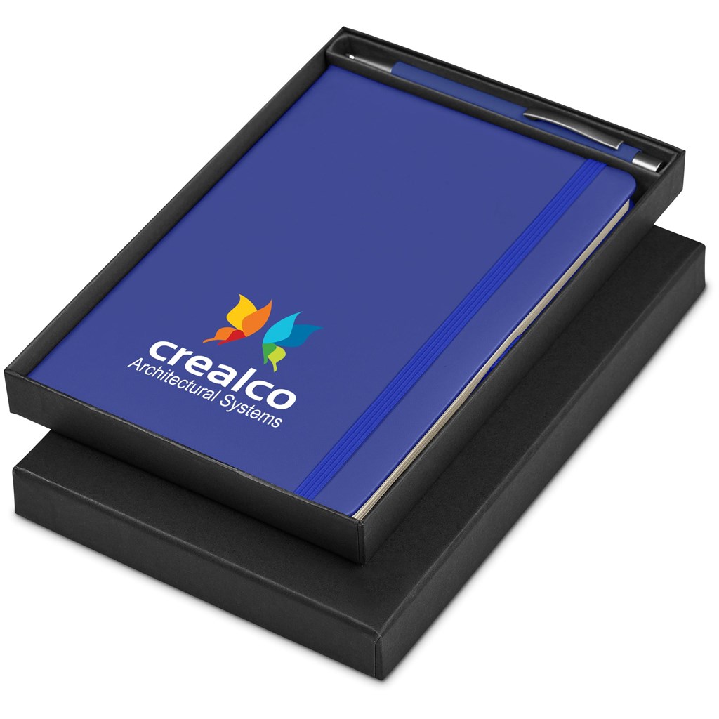 A popular A5 hard cover notebook is paired with a popular metal ball pen in a black, 2-piece, solid gift box.