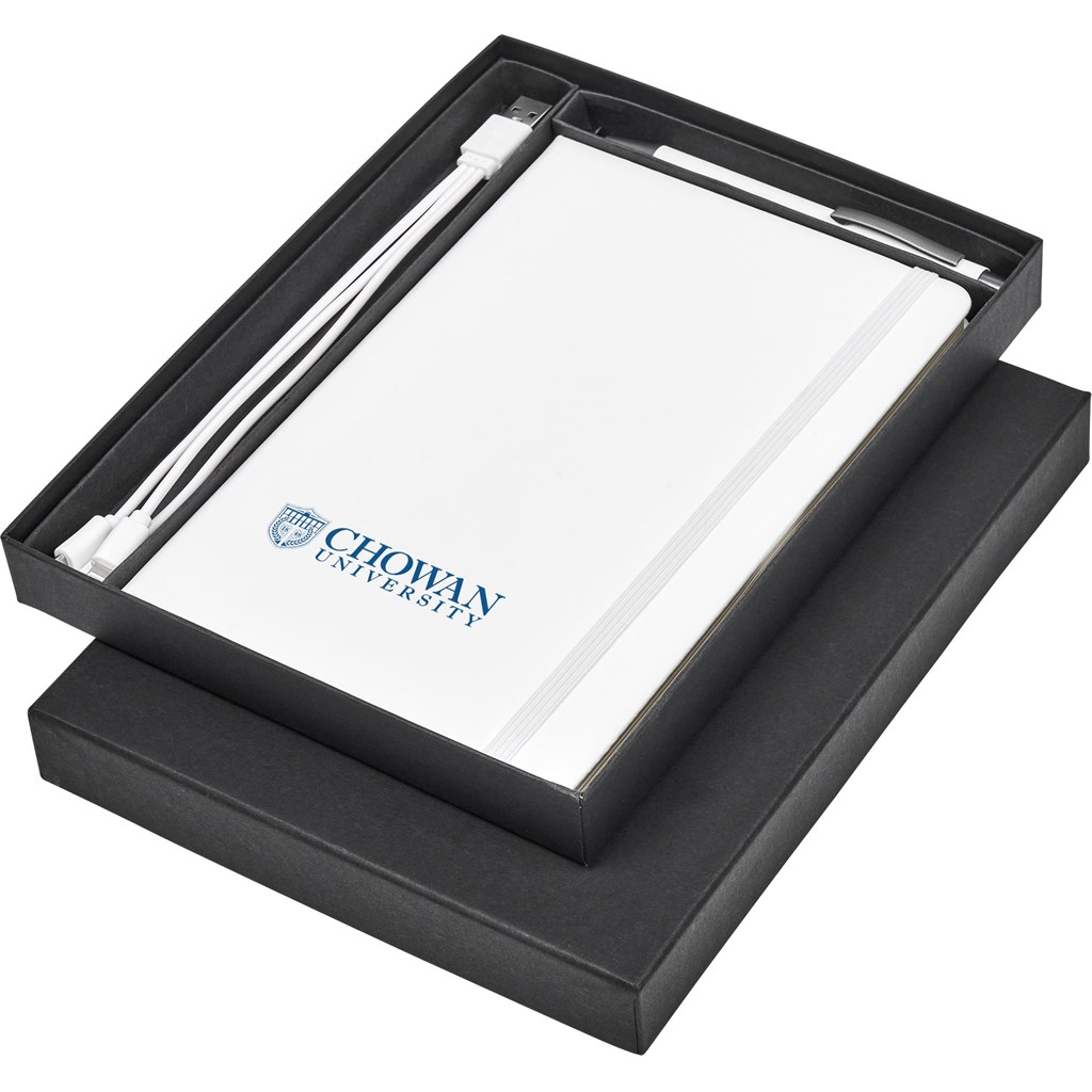 An A5 hard cover notebook, a metal ball pen and a 3-in-1 charging cable are combined in a black, 2-piece presentation box.