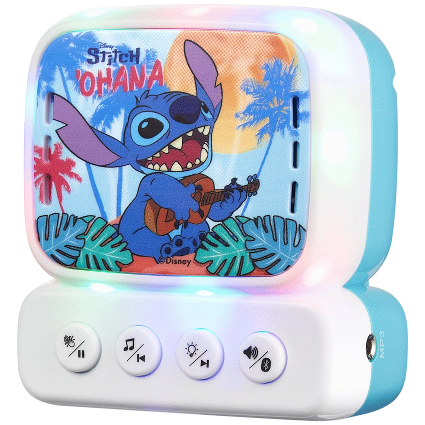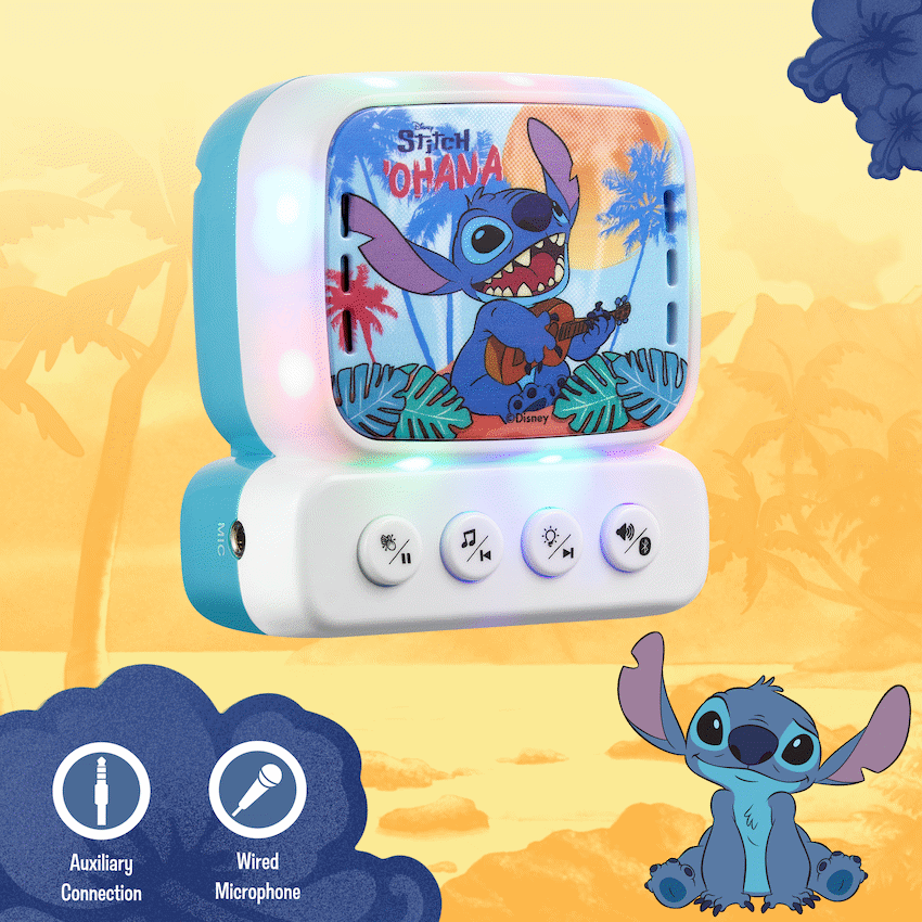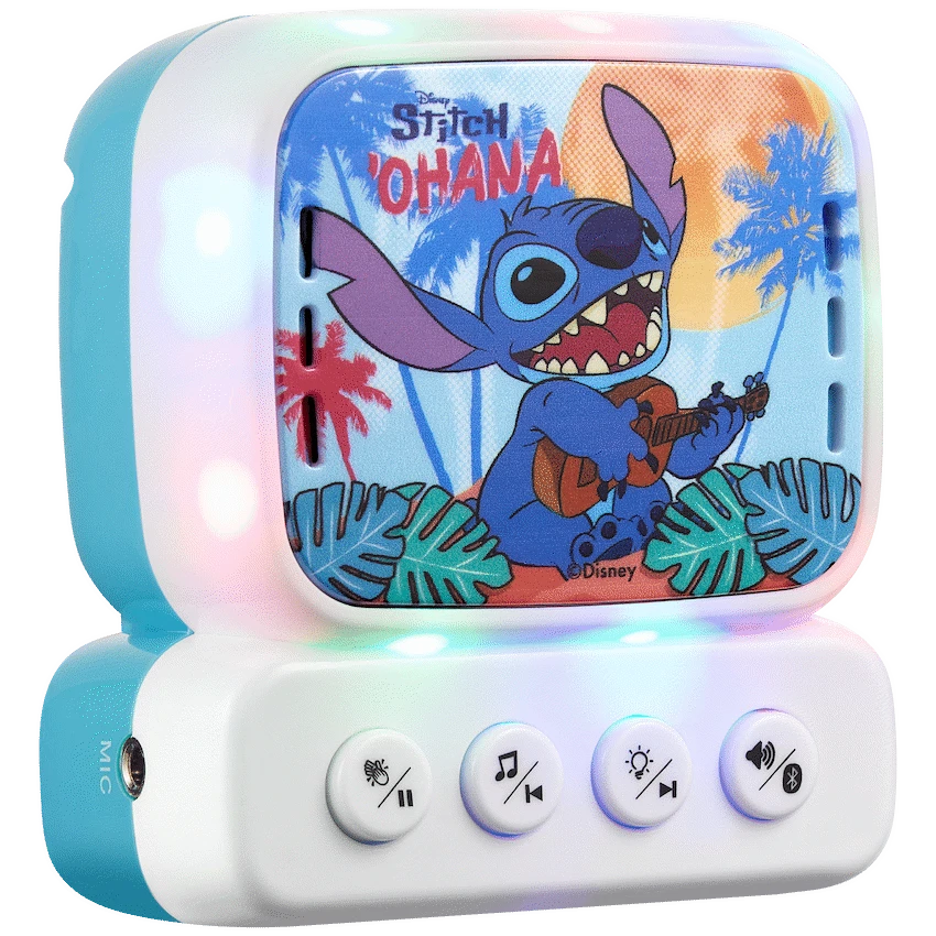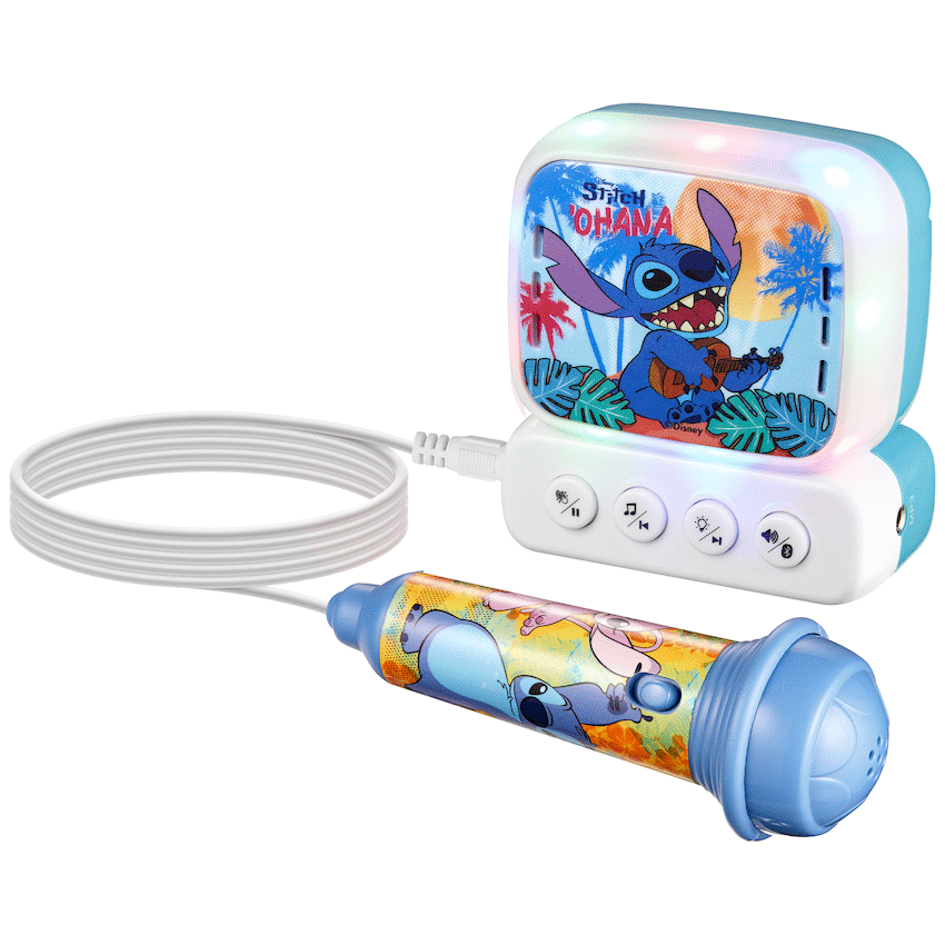 This Disney Stitch Bluetooth Mini Karaoke Machine lets children sing along to music anywhere. It uses Bluetooth 5.0 for wireless audio streaming and includes a belt hook for easy carrying. A child-friendly wired microphone is included, making it ideal for young Stitch fans.