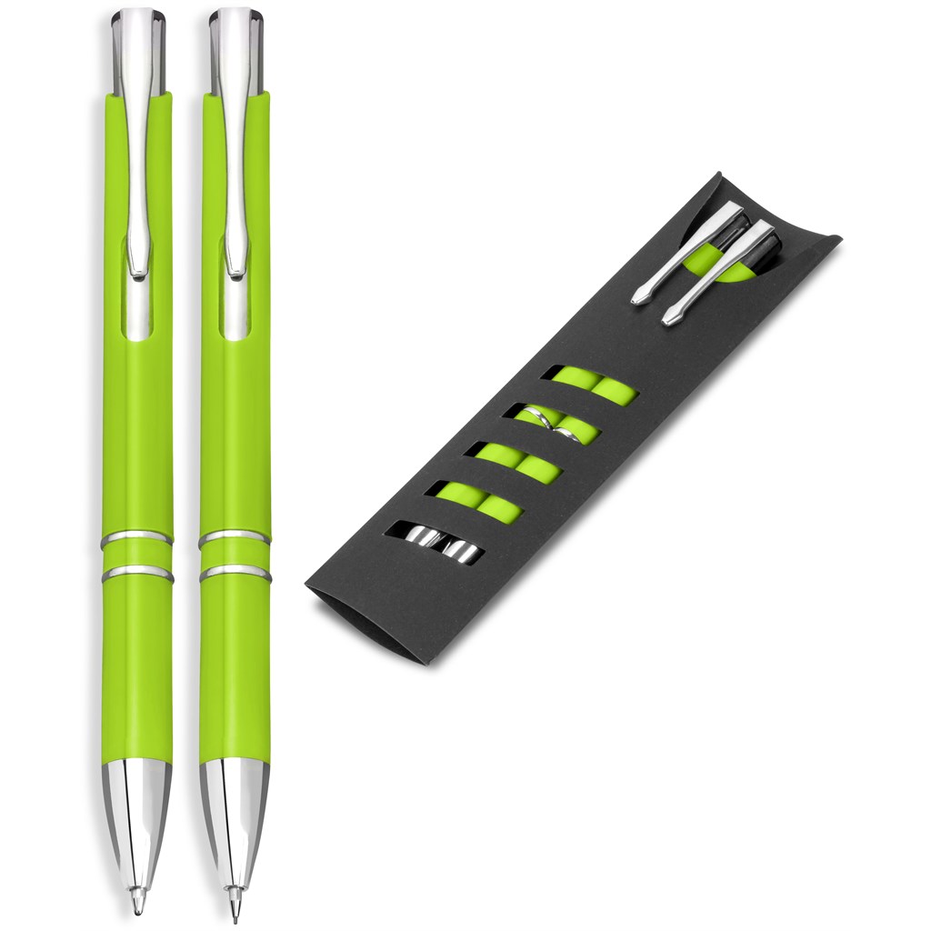 A matching plastic ball pen and mechanical pencil are paired together in a black cardboard pouch.