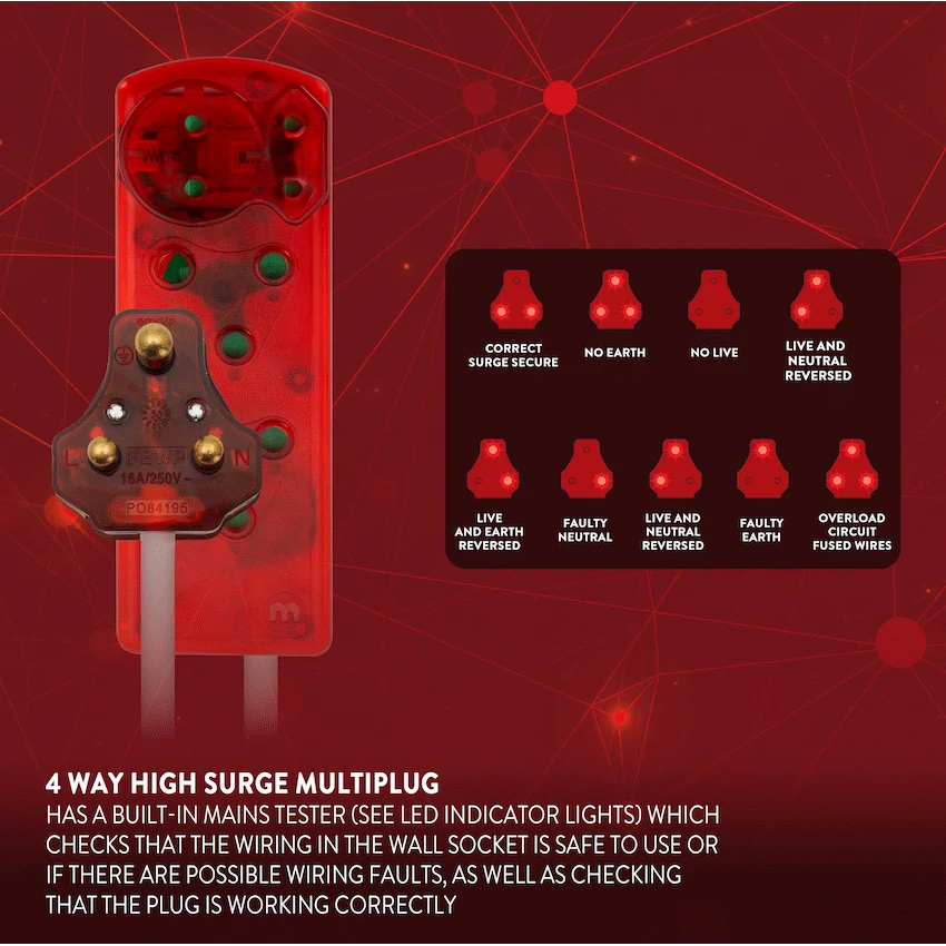 - Features four versatile outlets: 2x 16A (3-pin), 1x 5A (Euro), and 1x 10A (Schuko), suitable for various plug types often found in South Africa.
