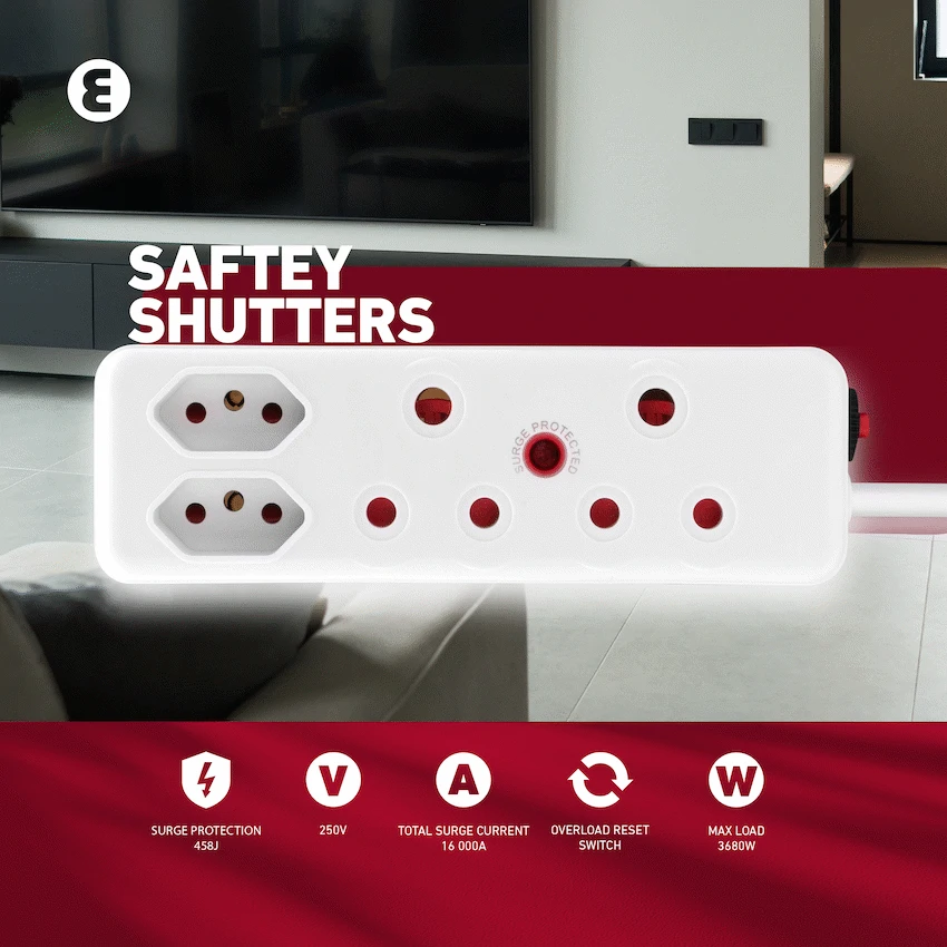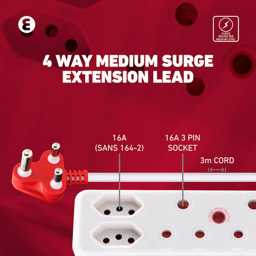 Protect your electronics with the Ellies 4-Way Medium Surge Extension Lead. It offers 458J surge and overload protection for valuable devices. This lead has two 16A 3-pin and two 5A Euro sockets, plus a 3-metre cable. A practical choice for any South African home or office.