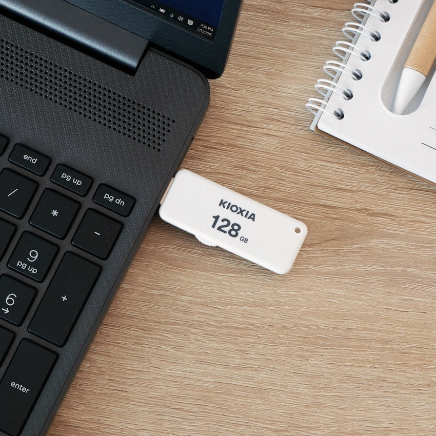Distribute digital information simply with the Kioxia U203W USB drive. It provides 128GB of storage capacity for your content. The Yamabiko slider design protects the USB 2.0 connector without needing a cap. Rely on Kioxia for dependable data storage.