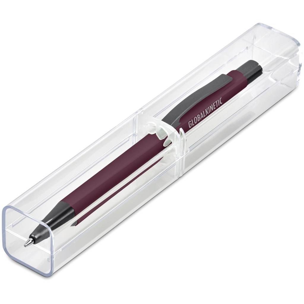 The rubberised finish of this metal pen gives it a pleasing tactile feel and an attractive appearance. Laser engraving offers a clean and precise effect which is both subtle and visible. The ball pen refill contains good quality, black German ink and will provide smooth, uninterrupted writing for a minimum of 1,500 metres. Presenting the pen in this transparent case gives it that impressive finishing touch.