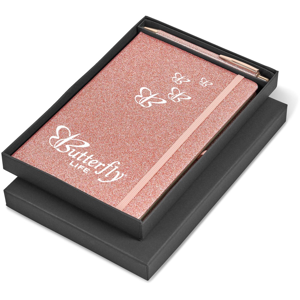 Bring a little sparkle into your day with this A5 notebook and matching ballpen, packaged in a 2-piece presentation box.