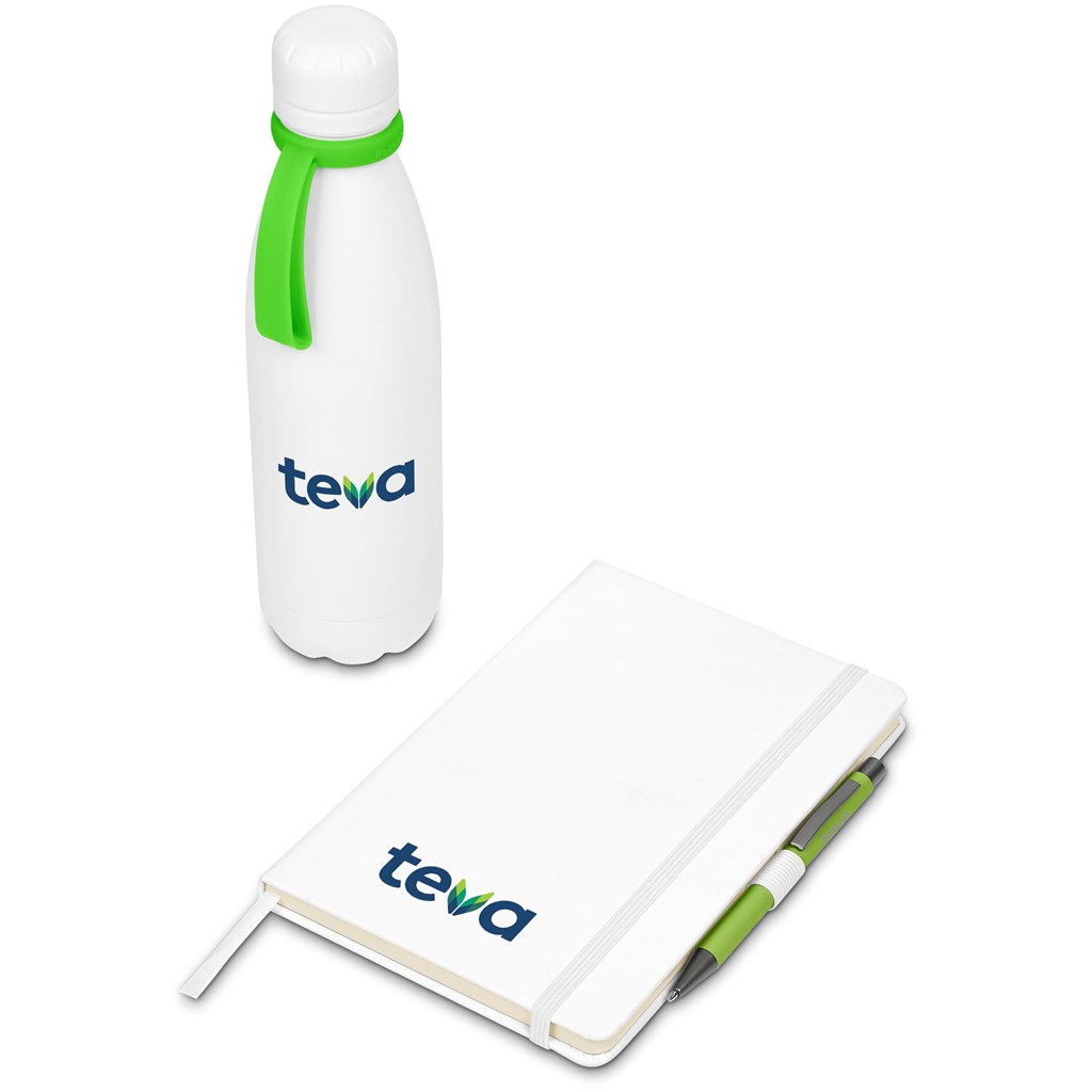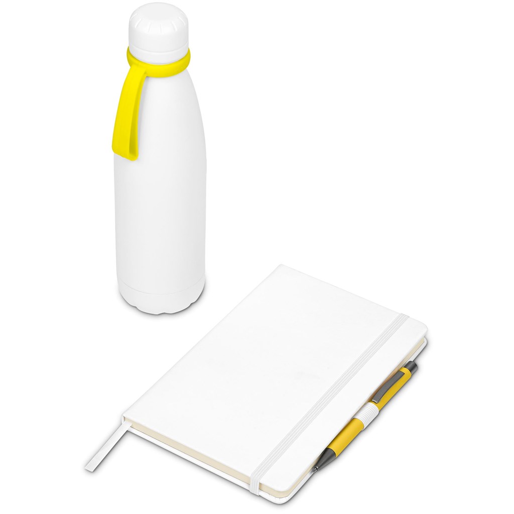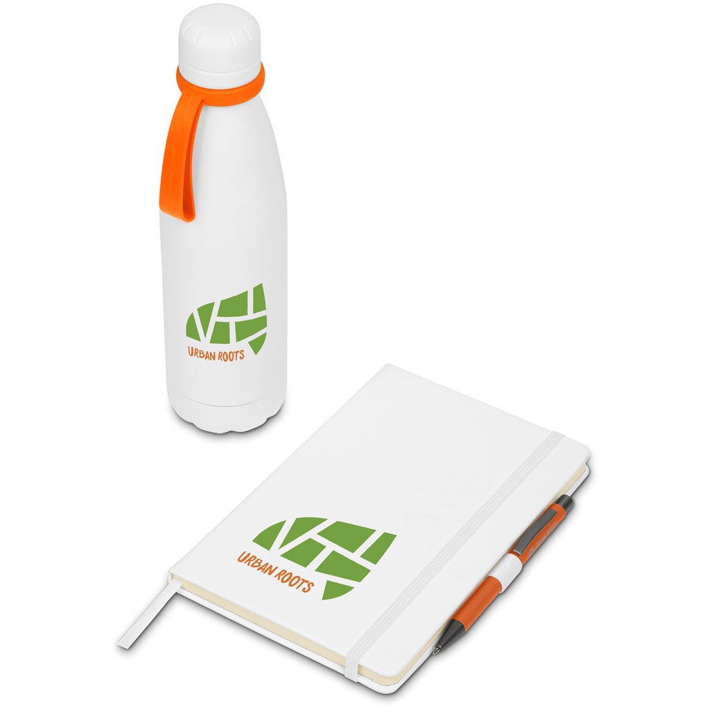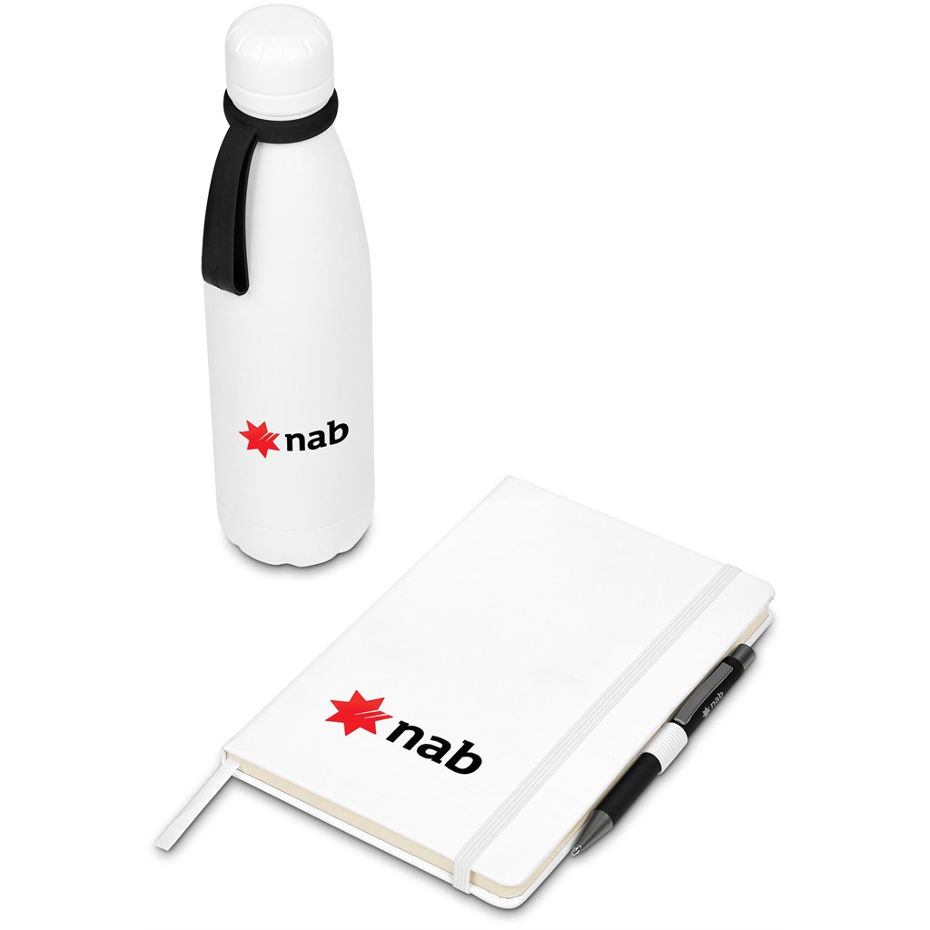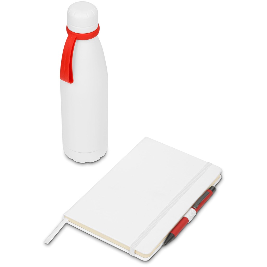 A vacuum water bottle, a notebook and a metal ball pen are neatly presented together in a gift box. The powder coated finish bottle has a double wall stainless steel vacuum construction, which will keep liquids inside the bottle cold or hot for hours.