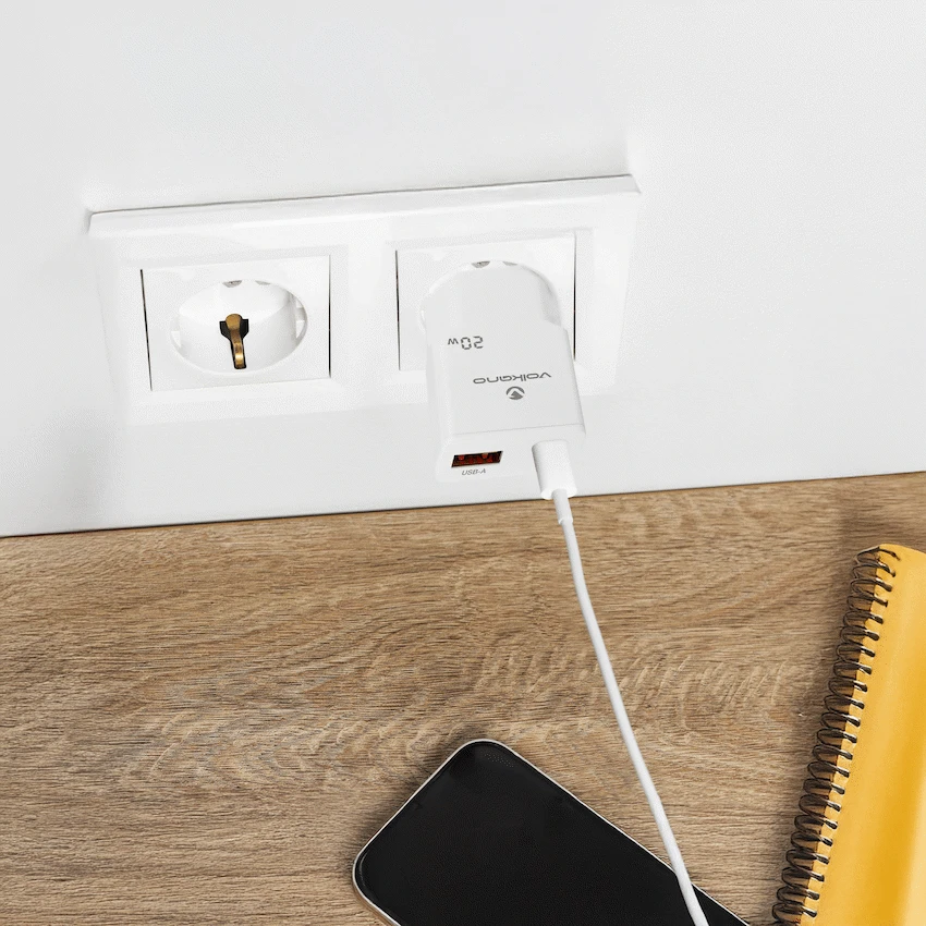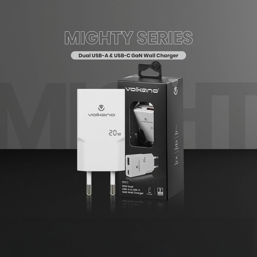 Efficiently charge two devices simultaneously with the Volkano Mighty Series 20W GaN Wall Charger. It includes both USB-A and USB-C ports, providing 20W power for smartphones and tablets. GaN technology ensures a compact design for this Volkano product.