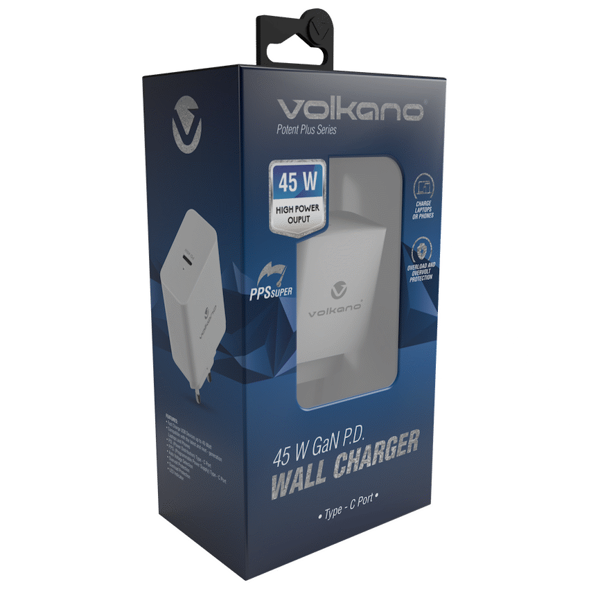 The Volkano Potent Plus Series 45W GaN Compact PD Wall Charger quickly charges compatible laptops and phones. It provides 45W Power Delivery via a Type-C port and has built-in safety protection. This compact Volkano charger offers reliable power.