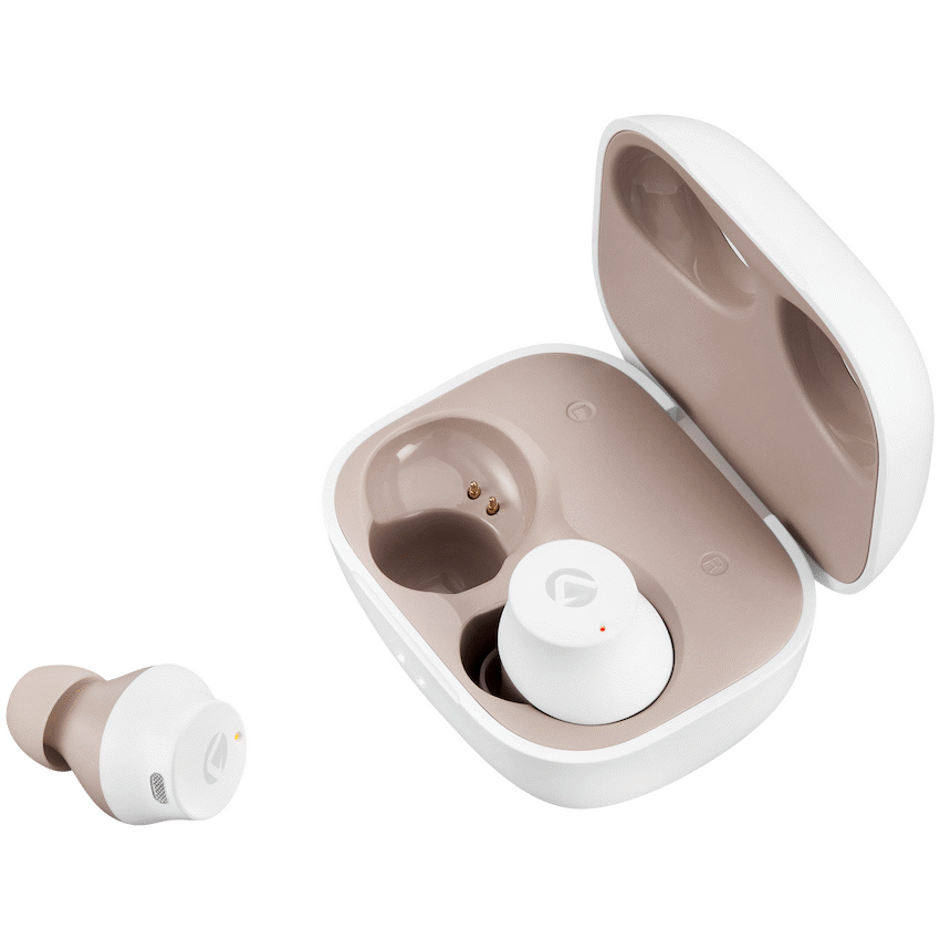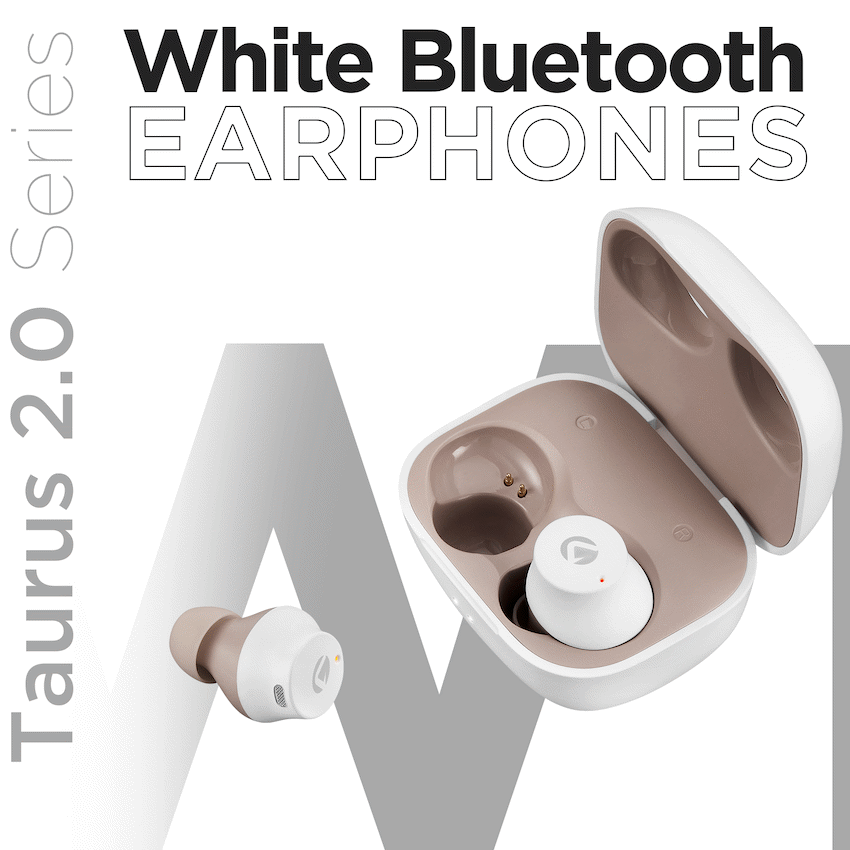• White Volkano Taurus Series 2.0 True Wireless Earphones provide cable-free audio.