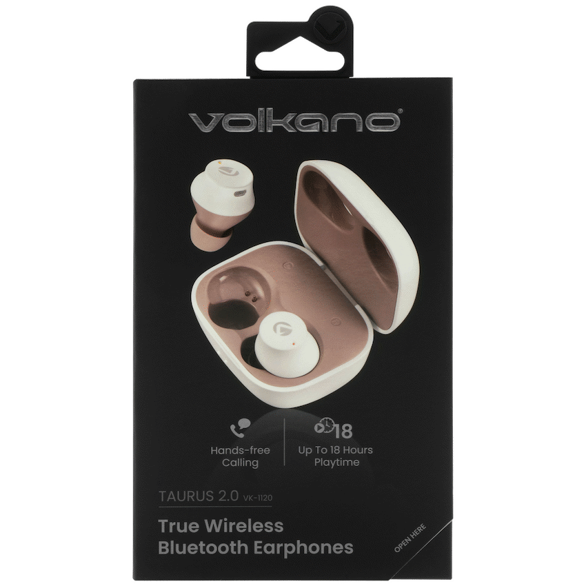 The Volkano Taurus Series 2.0 True Wireless Earphones in white offer clear, cable-free audio. Weighing just 1g, they provide comfortable listening for music and calls. This reliable audio accessory is part of the Volkano range.