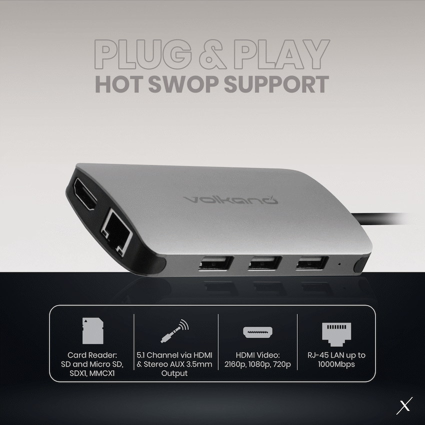 VolkanoX Core Multi Series USB Type-C – HDMI + 3x USB 3.0 + LAN + Card Reader + Audio + PD