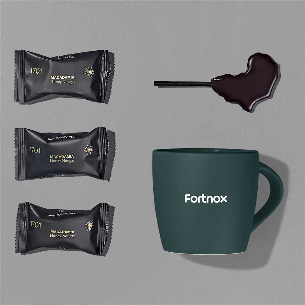This Yatta Bright Bites Hamper offers a pleasant corporate gift. It includes a 330ml ceramic coffee mug, a Yatta African Sucker, and three 1701 Nougat Minis. All items come presented in a Yatta drawstring bag.