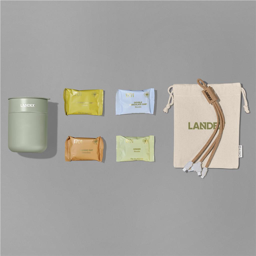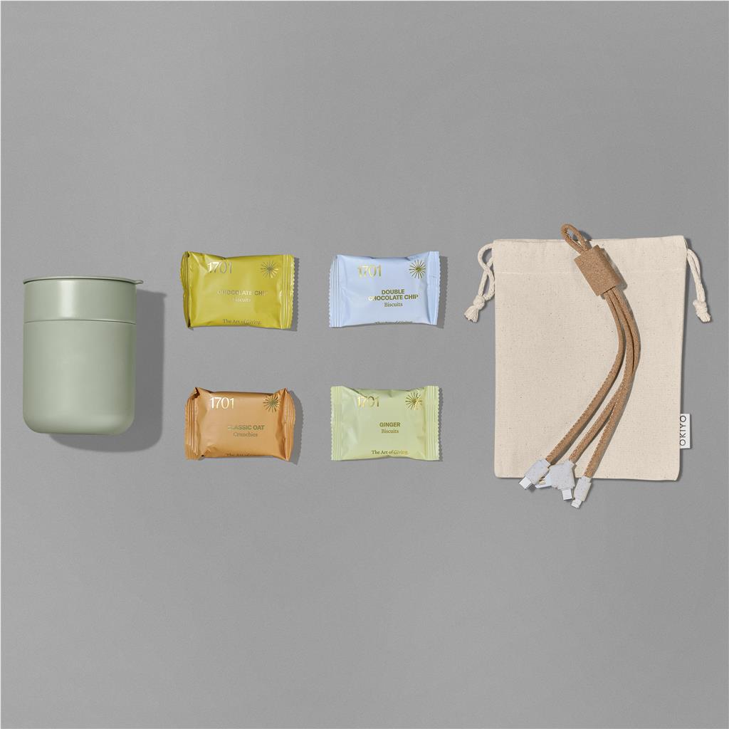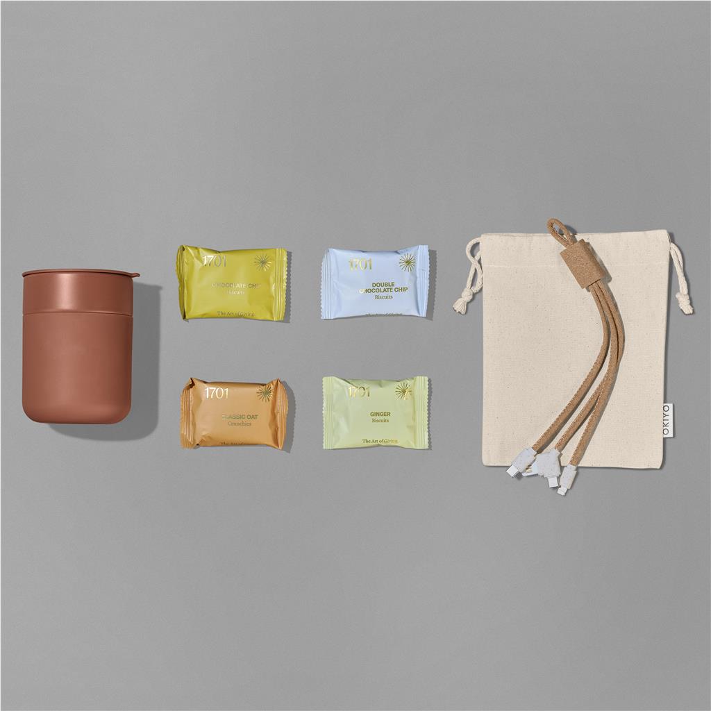 The Yatta Sweet Sip Hamper offers a pleasant work break for recipients. It features a 300ml ceramic coffee tumbler, an Okiyo charging cable, and four 1701 biscuits. This thoughtful corporate gift comes in a Yatta branded RPET felt bag.